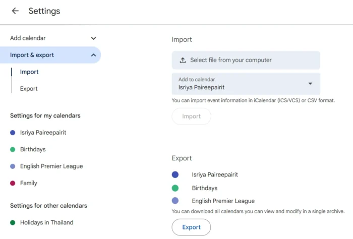 เมื่อได้ไฟล์ ics ขนาดเล็กๆ แล้วเราค่อยมานั่ง import กลับเข้าไปยัง Google Calendar ของเราเองทีละไฟล์ (ด้วยมือ 😂 นี่บริษัทระดับ trillion dollar company นะครับคุณ) เท่านั้นเป็นอันเรียบร้อย